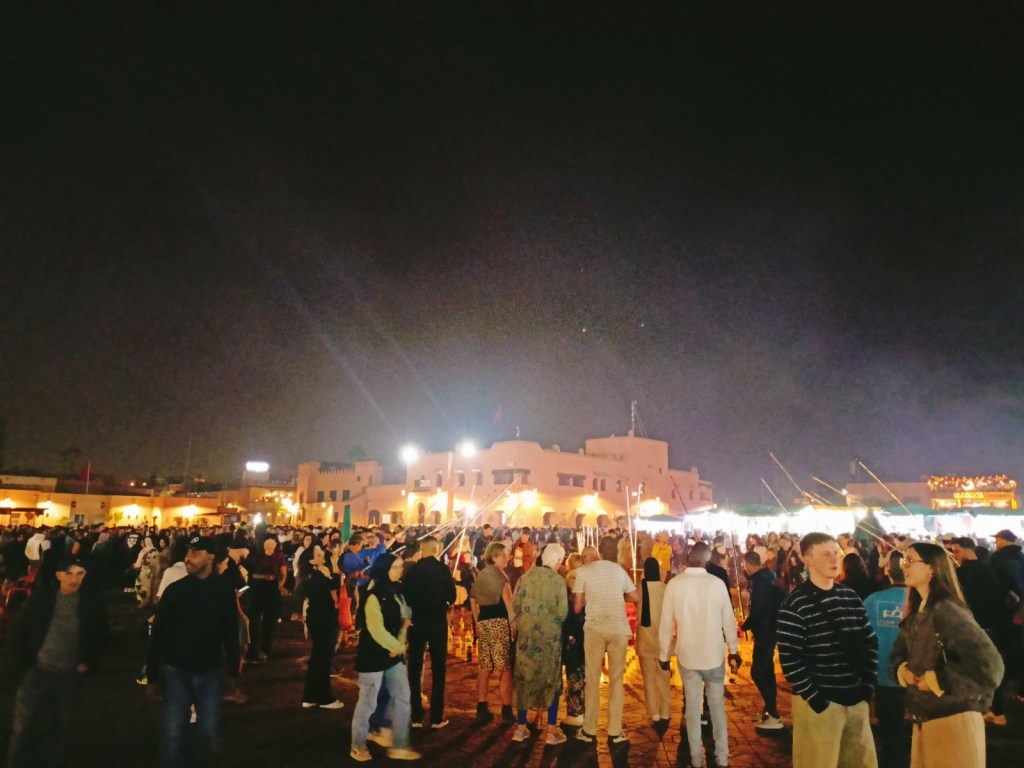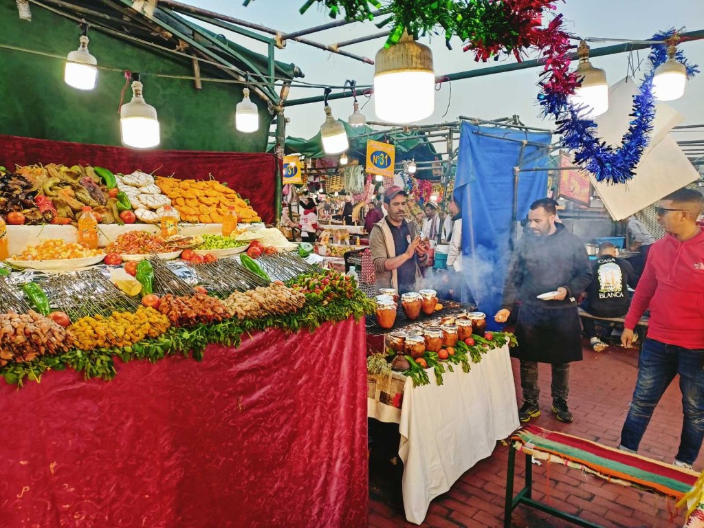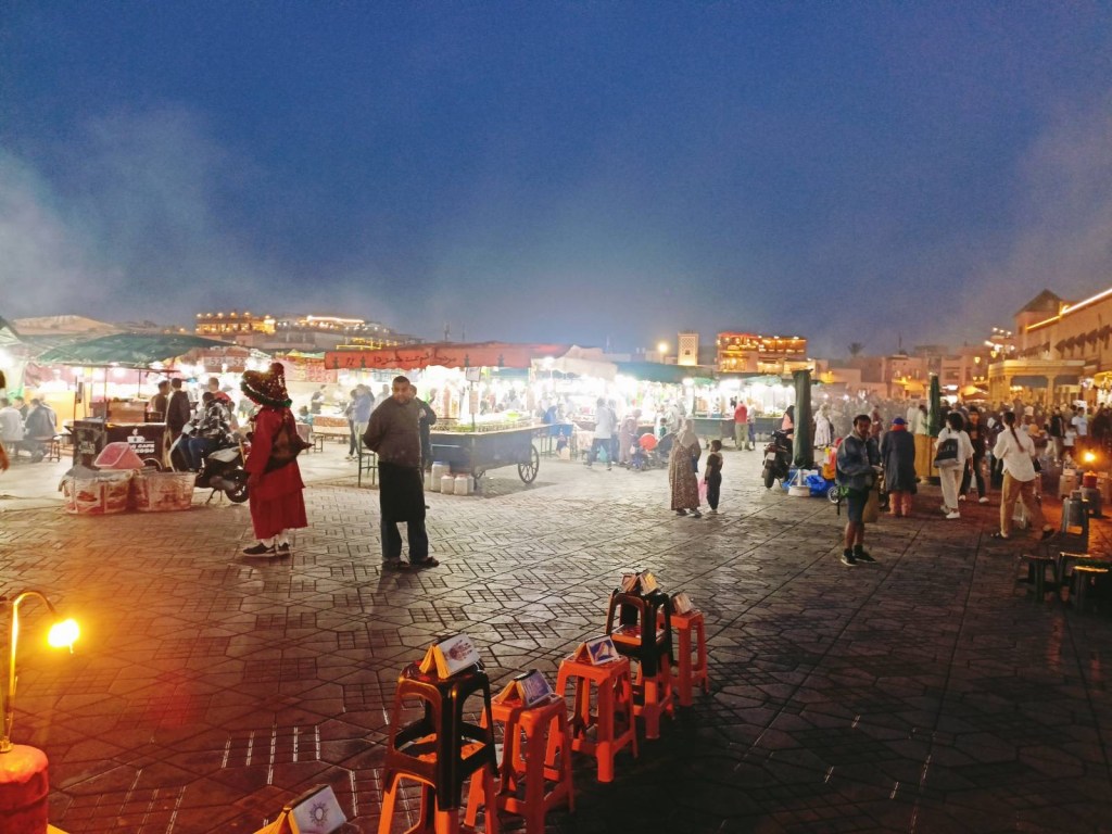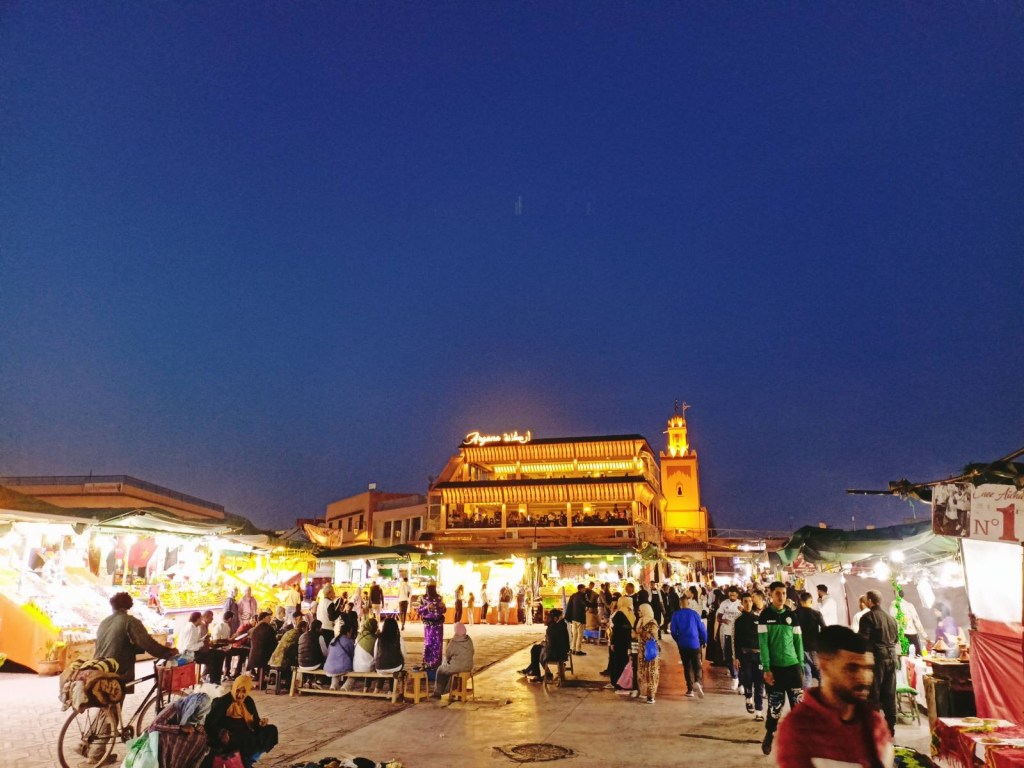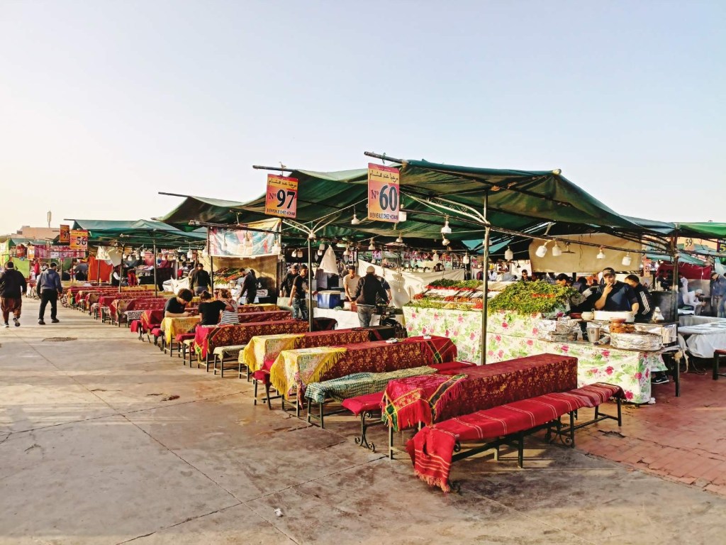 Peale päikeseloojangut sätitakse suurele turuplatsile üles üle saja restorani, kus igaüks leiab lihast tigudeni endale midagi meelepärast. Hinnad on põhiplatsil pisut kõrgemad kui mõni tänav sisse poole minnes, aga vaade on seda väärt!